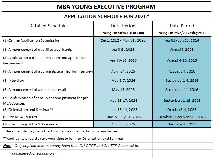 ทำการสมัครในระบบรับสมัครสอบออนไลน์ตามช่วงเวลาที่หลักสูตรประกาศรับสมัคร (ยังไม่ต้องส่งเอกสารใดๆมายังหลักสูตรฯ) - MBA office announces qualified applicants. Applicants pay application fee and submit application packet