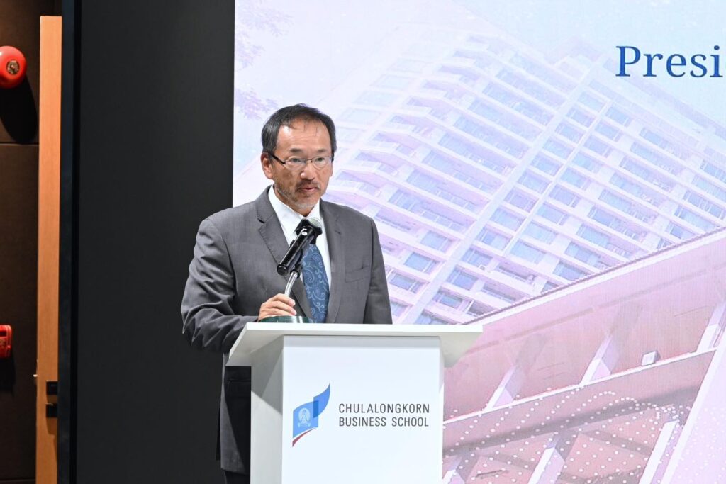 สำหรับการกล่าวปาฐกถาะพิเศษของ H.E. Mr. Masato Otaka ท่านได้กล่าวถึงความสัมพันธ์อันแน่นแฟ้นระหว่างประเทศไทยและญี่ปุ่นที่มีมาอย่างยาวนานซึ่งครอบคลุมทั้งในมิติของเศรษฐกิจ วัฒนธรรม และการศึกษา การบรรยายครั้งนี้ถือเป็นโอกาสอันทรงคุณค่าที่ช่วยเปิดมุมมองอื่นๆ นอกเหนือจากเชิงธุรกิจให้แก่นิสิต MBA จุฬาฯ ในการก้าวสู่การเป็นผู้นำที่สร้างสรรค์และขับเคลื่อนธุรกิจให้เติบโตไปพร้อมกับสังคมอย่างยั่งยืน อีกทั้งยังได้กล่าวแสดงความชื่นชมต่อความร่วมมือนี้ว่าเป็น “สะพานเชื่อมความสัมพันธ์” ที่สำคัญระหว่างไทยและญี่ปุ่น