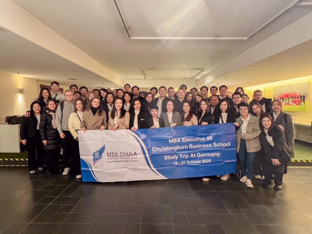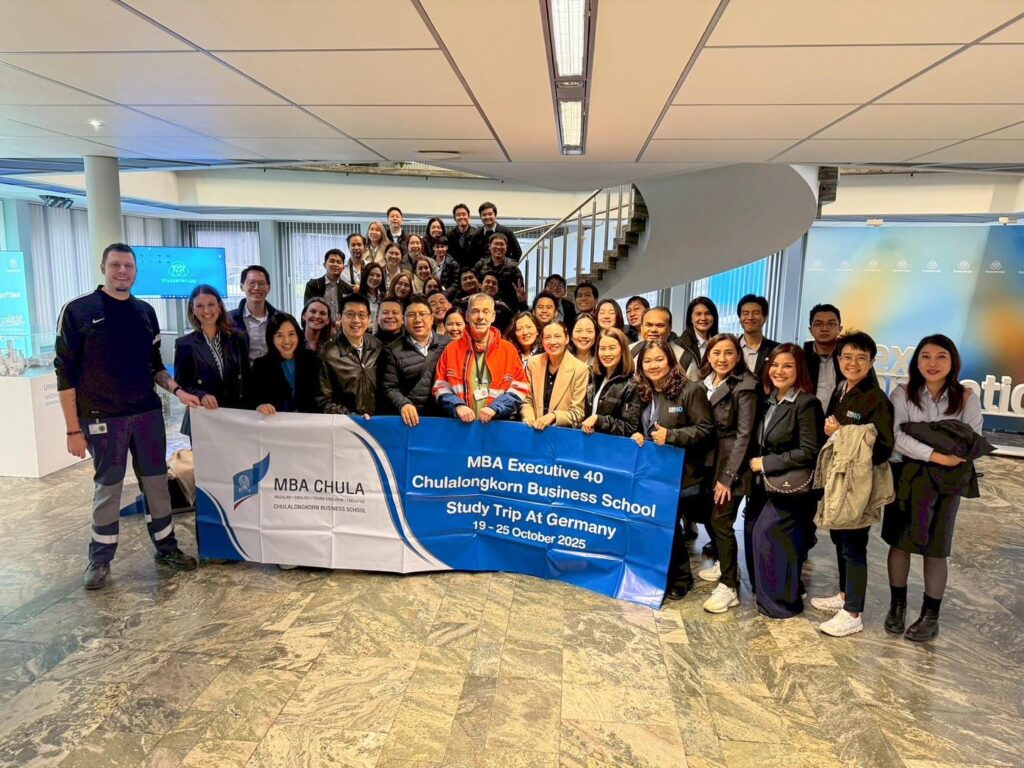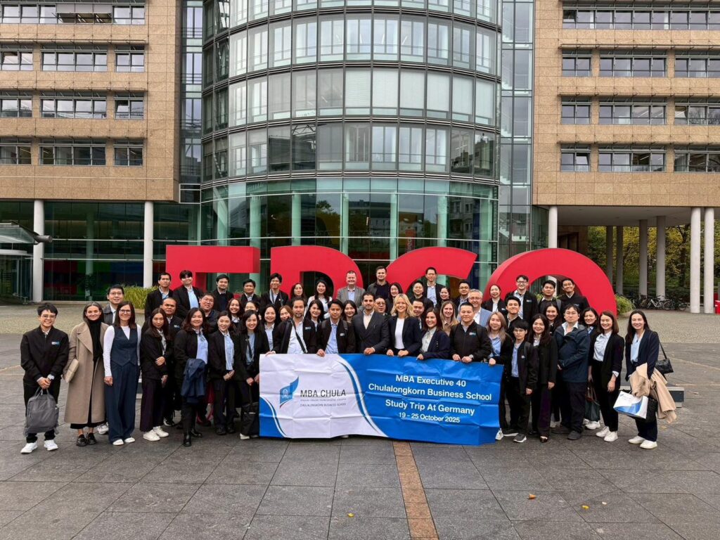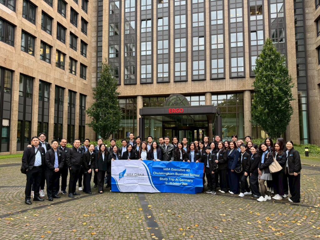 นิสิต MBA ได้เรียนรู้เกี่ยวกับ Innovation Strategy และ Digitalization ของ ERGO บริษัทประกันชั้นนำของประเทศเยอรมัน บนเส้นทางสู่การเป็น บริษัทดิจิทัลเต็มรูปแบบภายในปี 2025 โดยเทคโนโลยีอย่าง AI หุ่นยนต์ ระบบเสียง Process Mining และ Metaverse กำลังเปลี่ยนแปลงกระบวนการประกันภัย การฝึกอบรม และช่องทางบริการลูกค้าในอนาคต