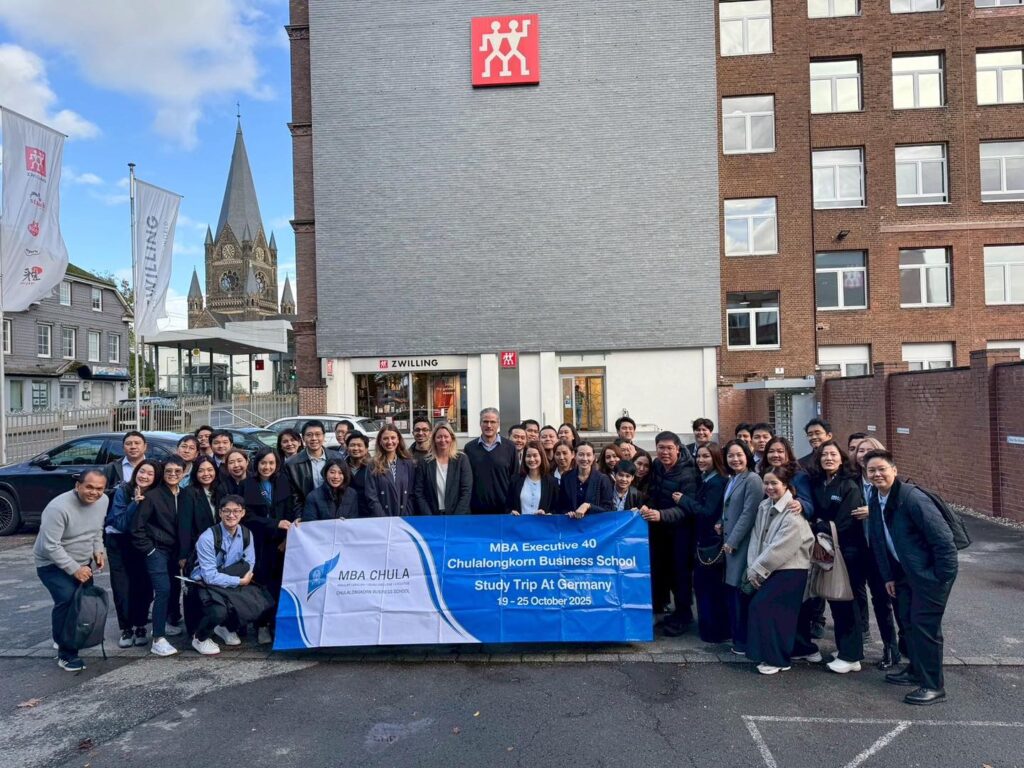 นิสิต MBA ได้เยี่ยมชม Zwilling แบรนด์เยอรมันระดับโลกที่มีชื่อเสียงด้านมีดคุณภาพสูง ระหว่างการทัวร์โรงงาน นิสิตได้เห็นกระบวนการผลิตที่โดดเด่นสามารถผลิตมีดได้มากถึง 15,000 เล่มต่อวัน ด้วยระบบอัตโนมัติขั้นสูงและเทคโนโลยีวิศวกรรมที่มีความแม่นยำ ตั้งแต่วัตถุดิบจนถึงผลิตภัณฑ์ ทุกขั้นตอนได้ผสานเทคโนโลยีหุ่นยนต์ เครื่องจักร และระบบสารสนเทศ เพื่อสร้างมีดที่มี ความคม ความแข็ง ความยืดหยุ่น และความทนต่อการกัดกร่อน อย่างสมบูรณ์แบบ ทั้งหมดนี้สะท้อนถึง ศิลปะแห่งการผลิตและนวัตกรรมของ Zwilling ที่สืบทอดต่อเนื่องมาหลายศตวรรษ